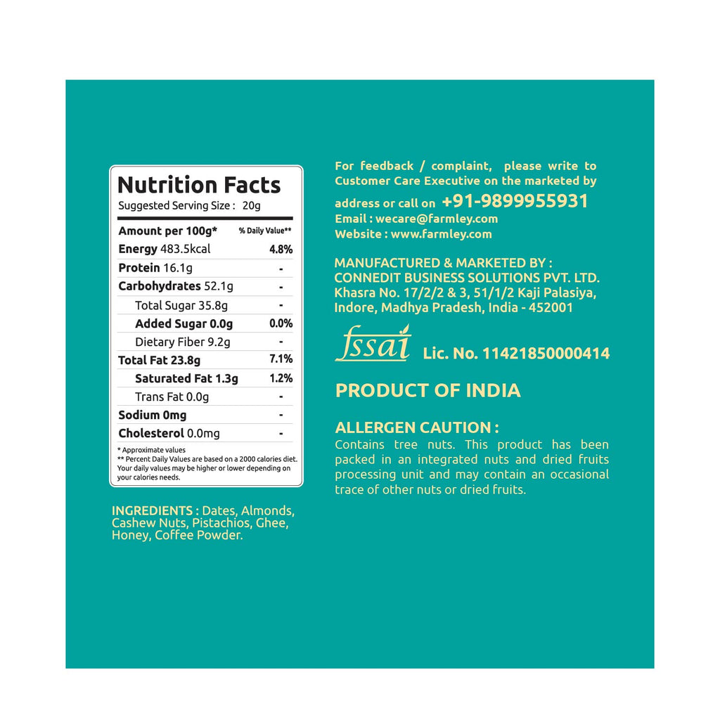 - Made using Farmley’s signature dry fruits and nuts, each bite is a powerhouse of flavour and nutrition, blending the richness of coffee with the natural sweetness of dates.