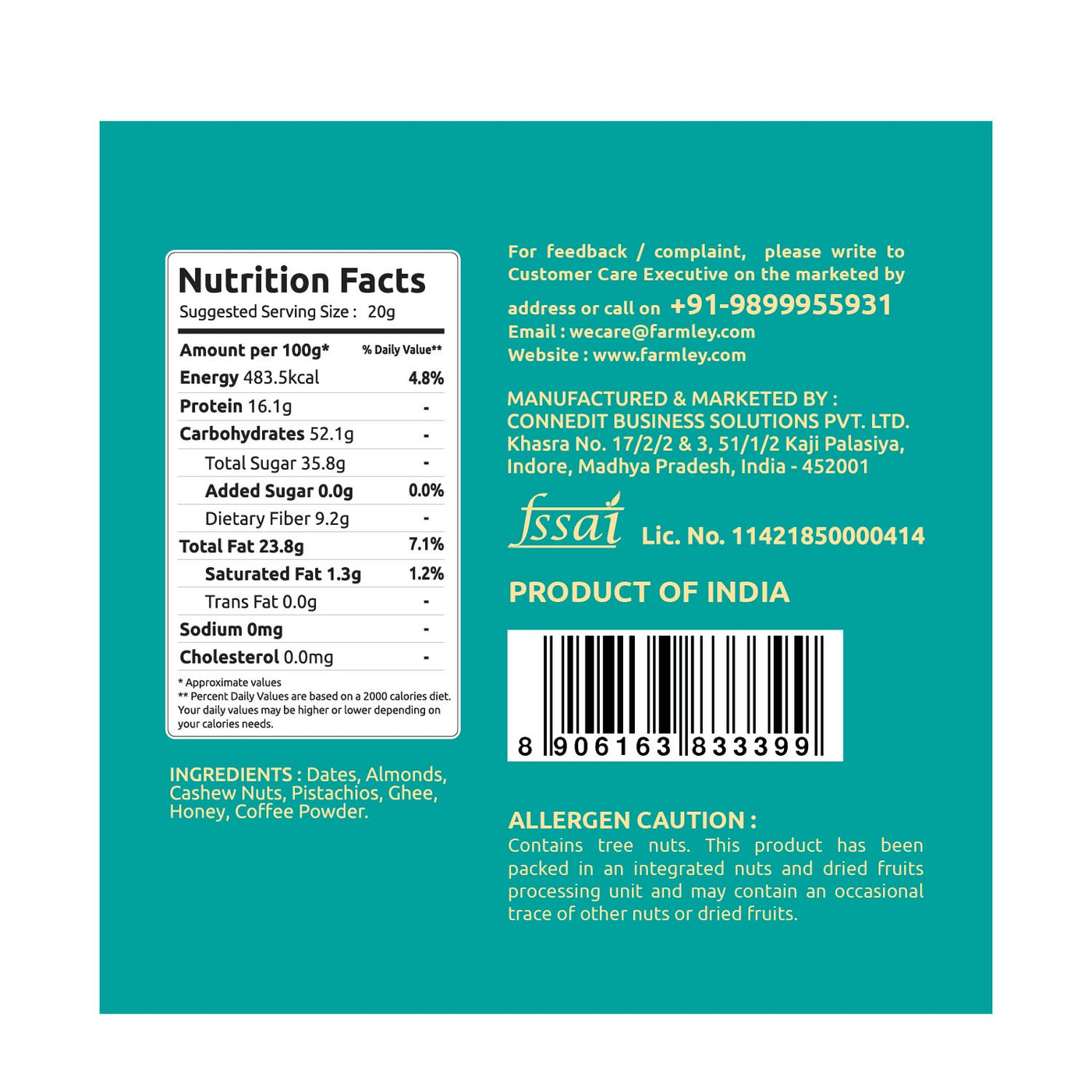 - Made using Farmley’s signature dry fruits and nuts, each bite is a powerhouse of flavour and nutrition, blending the richness of coffee with the natural sweetness of dates.