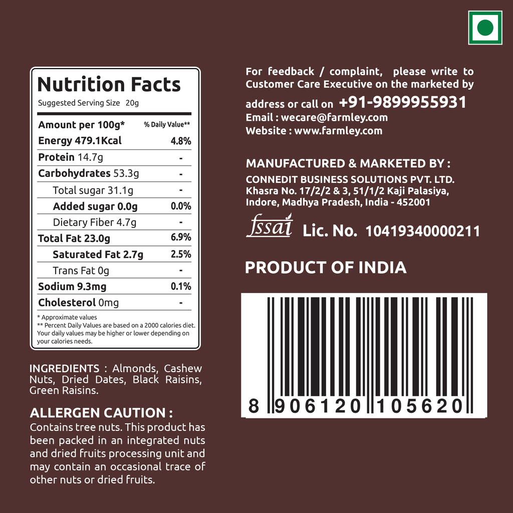 - Offering the goodness of - Almonds, Cashews, Green Raisins, Black Raisins & Dates all at once, the product has been designed to be consumed on-the-go.