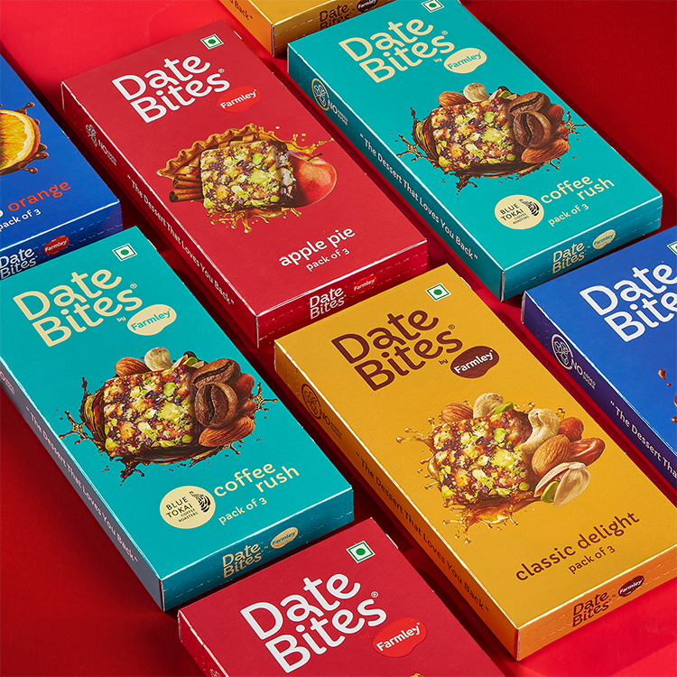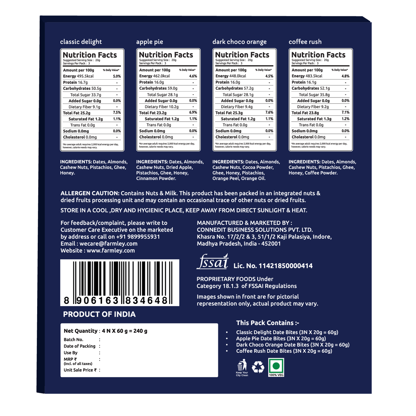 Farmley’s Valentine’s Date Bites Box brings together all our most-loved flavours- Classic, Apple Pie, Choco Orange and Coffee, thoughtfully crafted with wholesome ingredients like dates, nuts, honey and ghee.